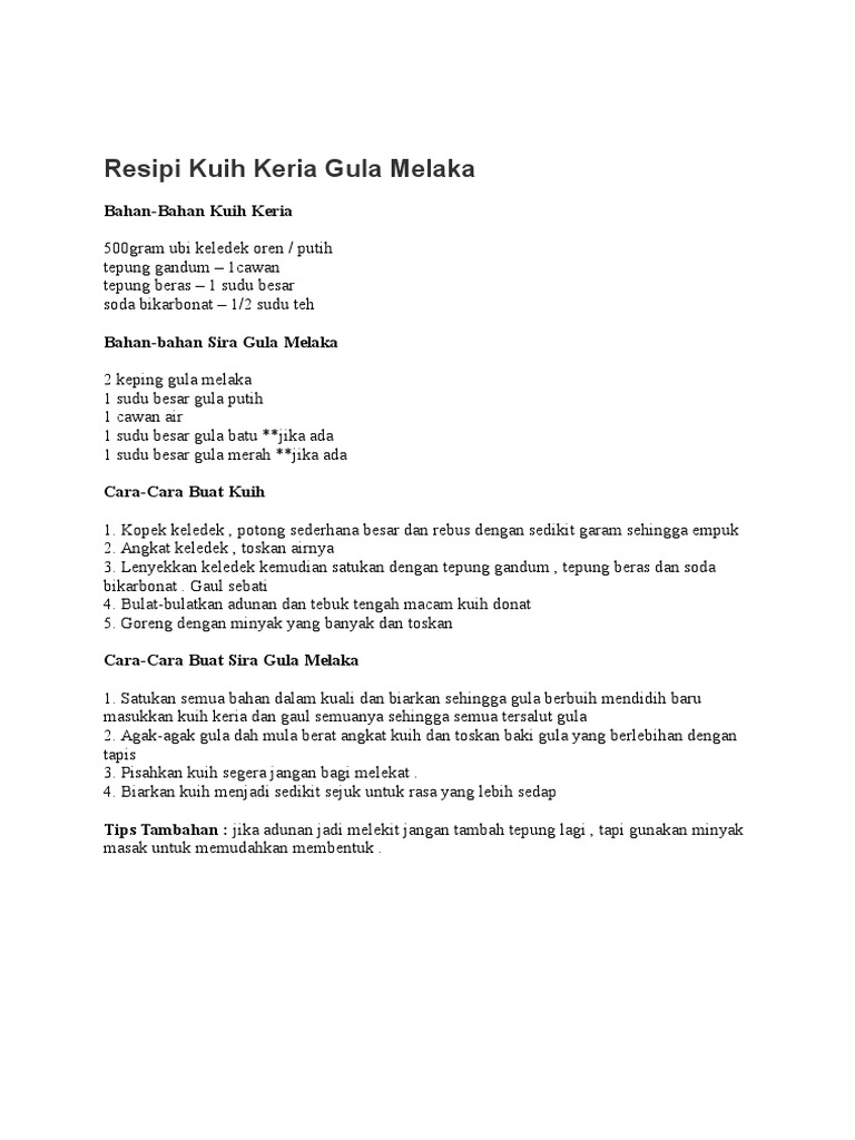 Resepi kuih keria 1 kilo ubi keledek 1 1/2 tepung gandum 1 sudu teh garam sedikit pewarna kuning untuk sira 3/4 cawan gula. Cara buat bahan keria : Melaka sugar ingredients 250 grams of malacca sugar or brown sugar 1 tablespoon white sugar (can be added if sweet) 1/4 cup water. Kuih keria ubi keledek ungu merupakan kuih tradisional yang disukai ramai. 500gram (3 biji saiz sederhana) ubi keledek manis 1 cawan tepung gandum 1 sudu kecil.